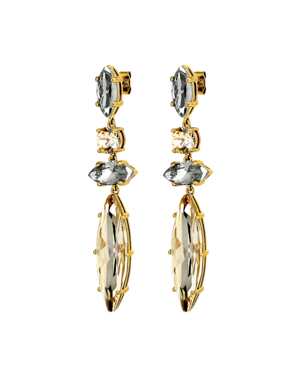 TENERE is a super elegant and longer ear jewel to wear when you want to really stand out. The beautiful crystals in different round and navette shapes are faceted and come in different contrasting colors and shapes - and are set in a lightweight setting. The jewellery is designed in polished brass with a surgical steel overlay. Here shown in gold toned and a mix of light and darker golden and grey crystals. The length is about 65 mm. Designed in Denmark and free from cadmium, nickel and lead. - Eigenschappen